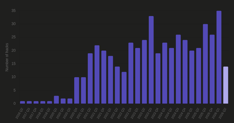 Hacks are not uncommon, but the frequency has clearly increased. Q1 of 2026 is the highest ever recorded number of DeFi hacks, and while Q2 has JUST begun, it is already on track to break the previous quarter’s results.