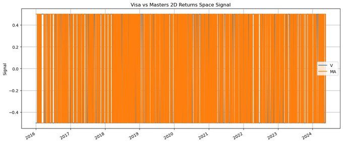 plt.show()We can construct a signal following the principle described above. The raw signal is the displacement of the 2D returns of an instrument from the pair’s mean. If we (boldly) assume that visa and masters have similar factor loadings, we do not need to modify the existing weights, since being dollar neutral implies factor neutrality if the assumption holds.
